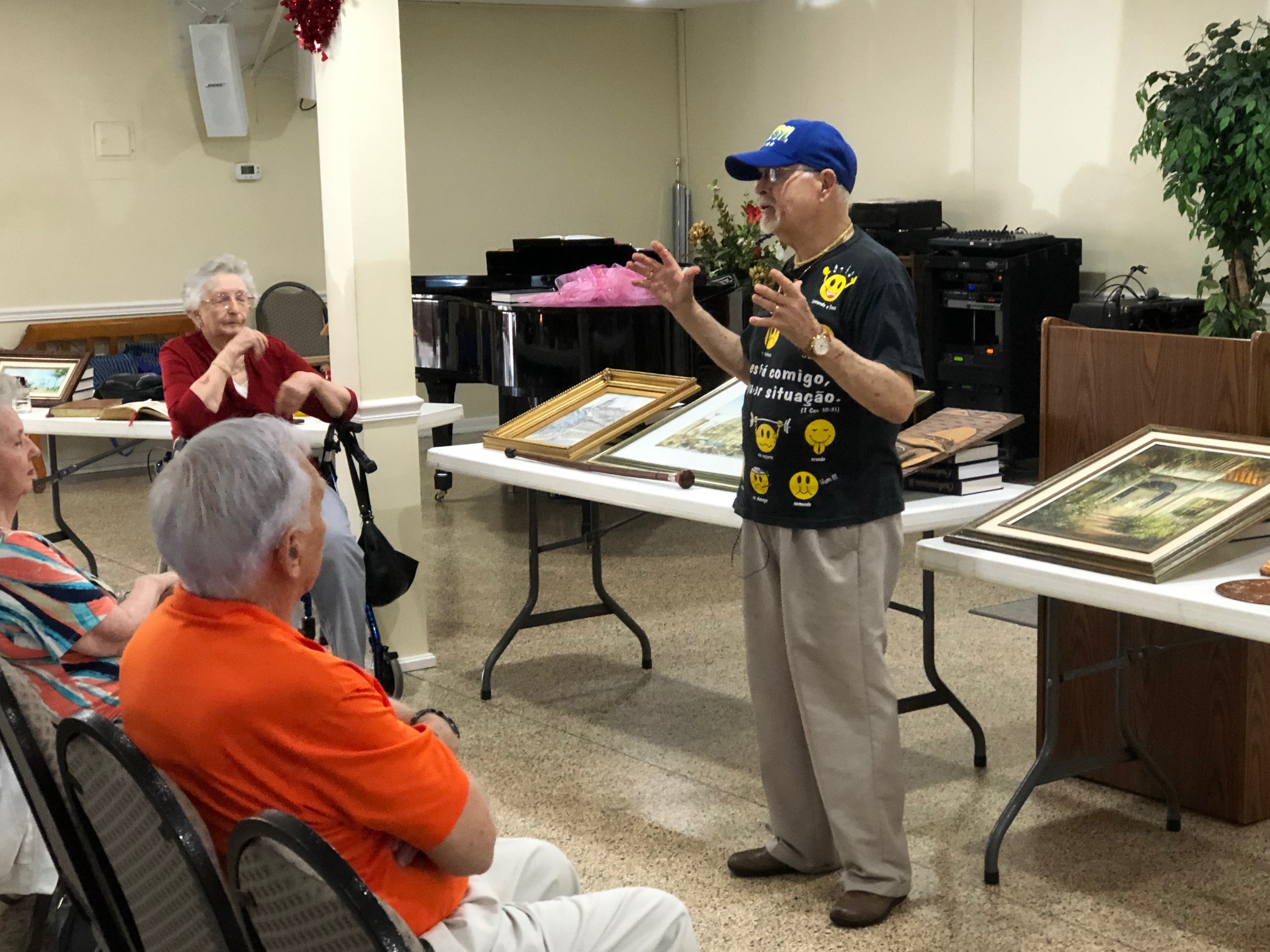 Dressed in Brazilian hat and T-Shirt, Pastor Carl Romey talked about his call to become a Missionary in Brazil and the many changes in his life leading up to the journey to Brazil, in Brazil and back to the U. S. His story was so powerful because he felt the call to become a Missionary at 10 years old. Then, God, led him to want to become a Missionary in Brazil through a Missionary, Charles Gates, who touched him while in college. While his wait for the call to Brazil was along a hard and diverted path, he and Shirley finally received the call to go. They studied and read and prayed to prepare for their new life in Christ. He told about how difficult it was to land in a country, life in a neighborhood, where all spoke Portuguese. He and Shirley struggled to learn the language because bringing folks to accept Christ required a fluent use of Portuguese. He learned the culture, language, foods, art and made new friends in Brazil. He planted churches in many areas of Brazil and took the place of Charles Yates just as God had planned it for Carl. Carl said, “God makes a way when he wants something to happen.” And God wanted Pastor Carl to share Jesus Christ in Brazil.